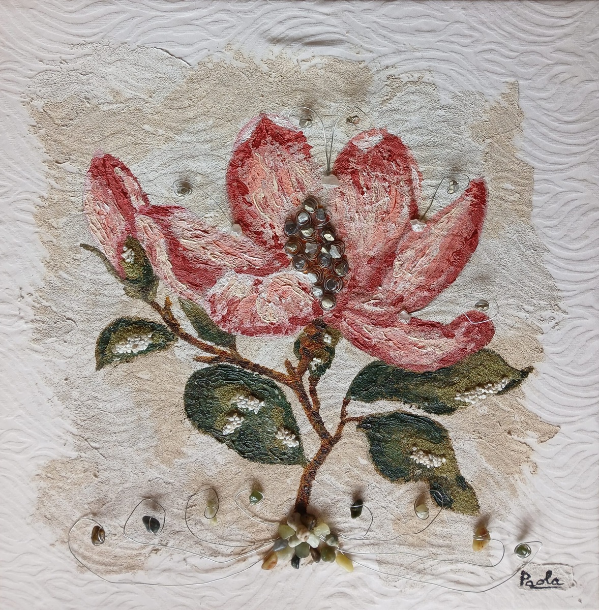 Introducing: In addition to researching various materials, I added the movement of iron wires to this canvas, inspired by the caper flower. The canvas moves, and depending on the light, the mother-of-pearl petals create a play of light that gives movement to the work.